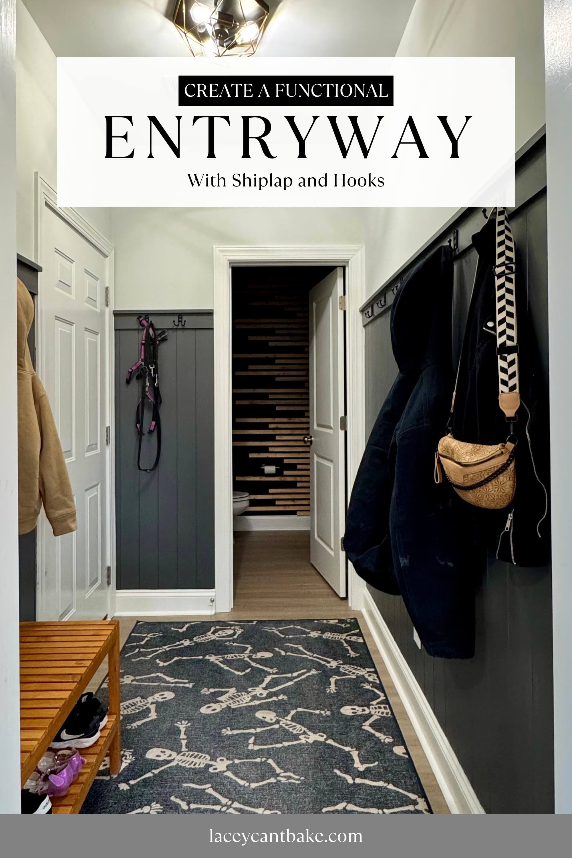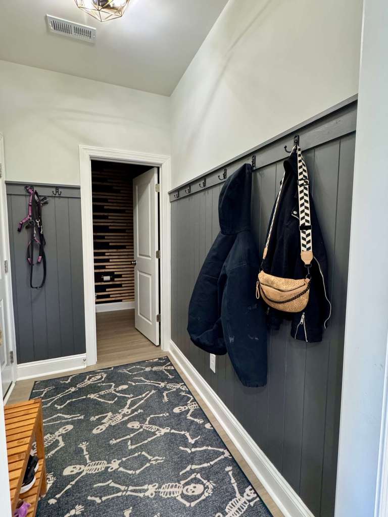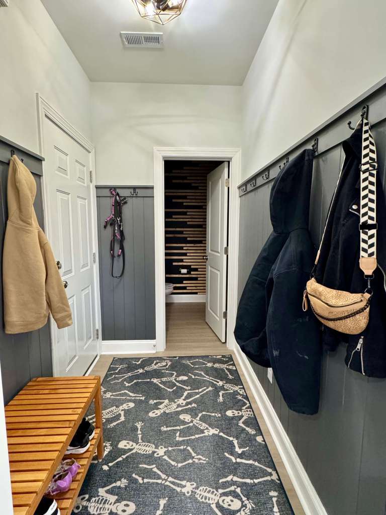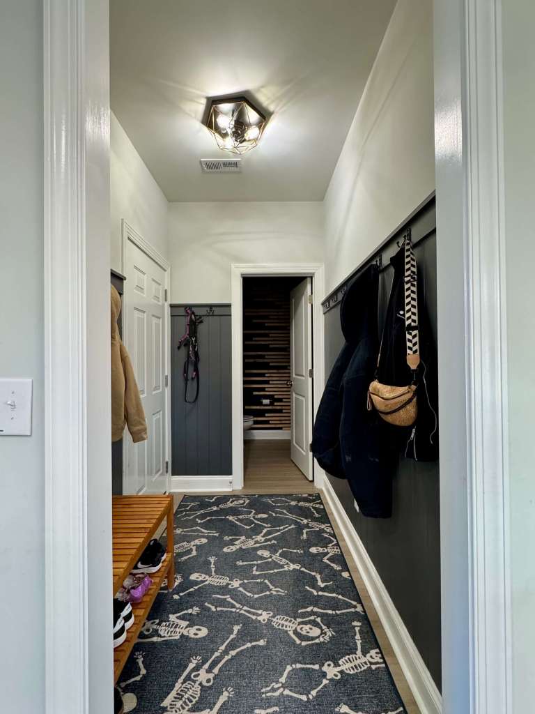 Yes, we do keep our halloween skeleton rug out year round! And no, I do not regret all of those hooks. There are days where we use every single one, although I try to limit it to one jacket per person here and put the rest in our hall closet.