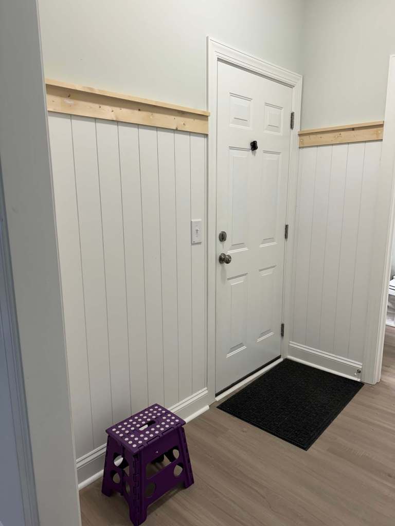 My husband and I both loved the look of board and batten and shiplap. Since we did the board and batten look in our old house, we opted to go for the shiplap look here. I say shiplap look, because we were too cheap to buy actual shiplap, and opted for the shiplap sheets. Here’s a sneak peak at the final product before we get into it more.