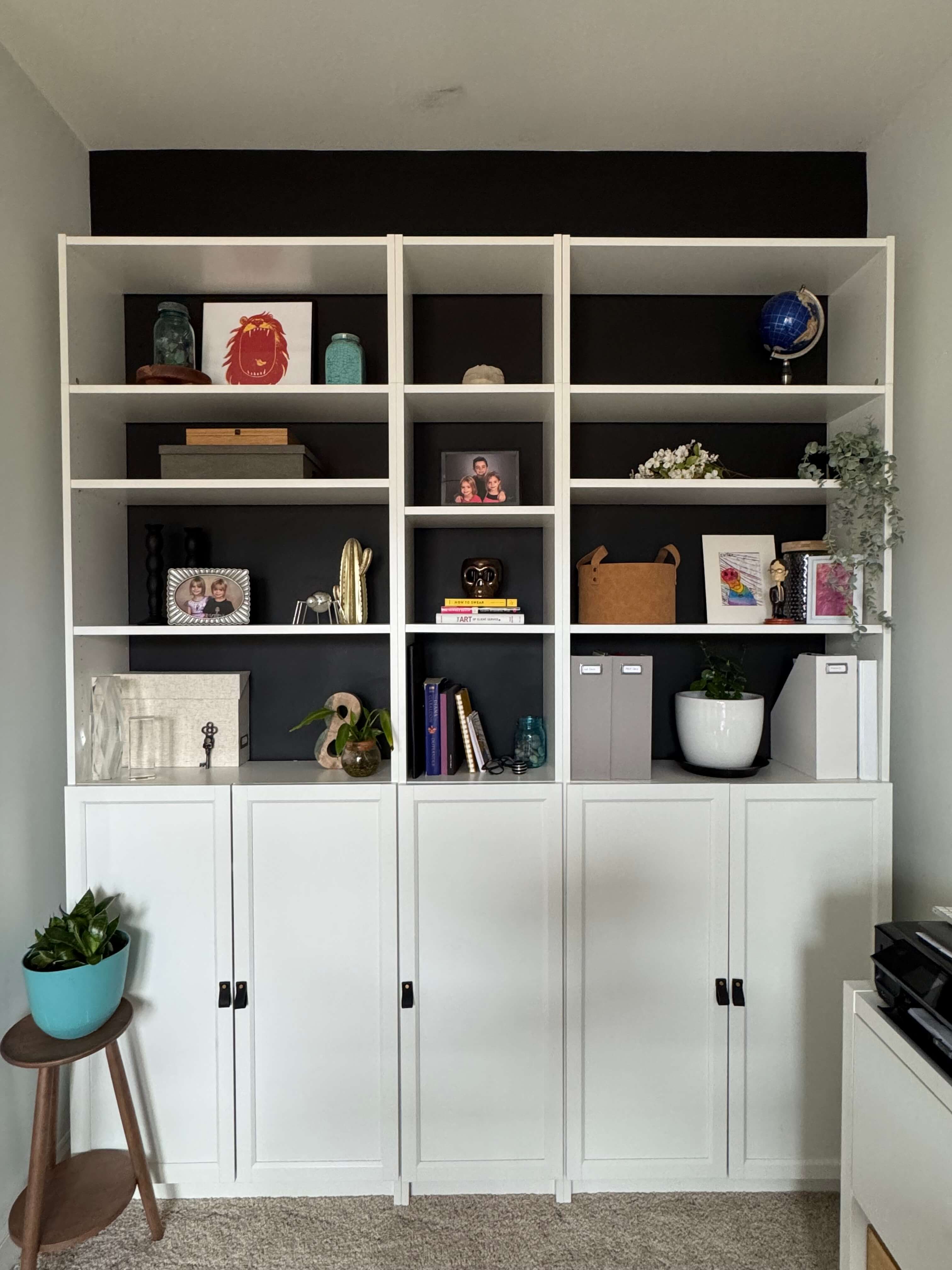 One thing to note is that the Billy bookcases come with a backing, which we opted not to use so that the black wall could be seen behind the shelves.